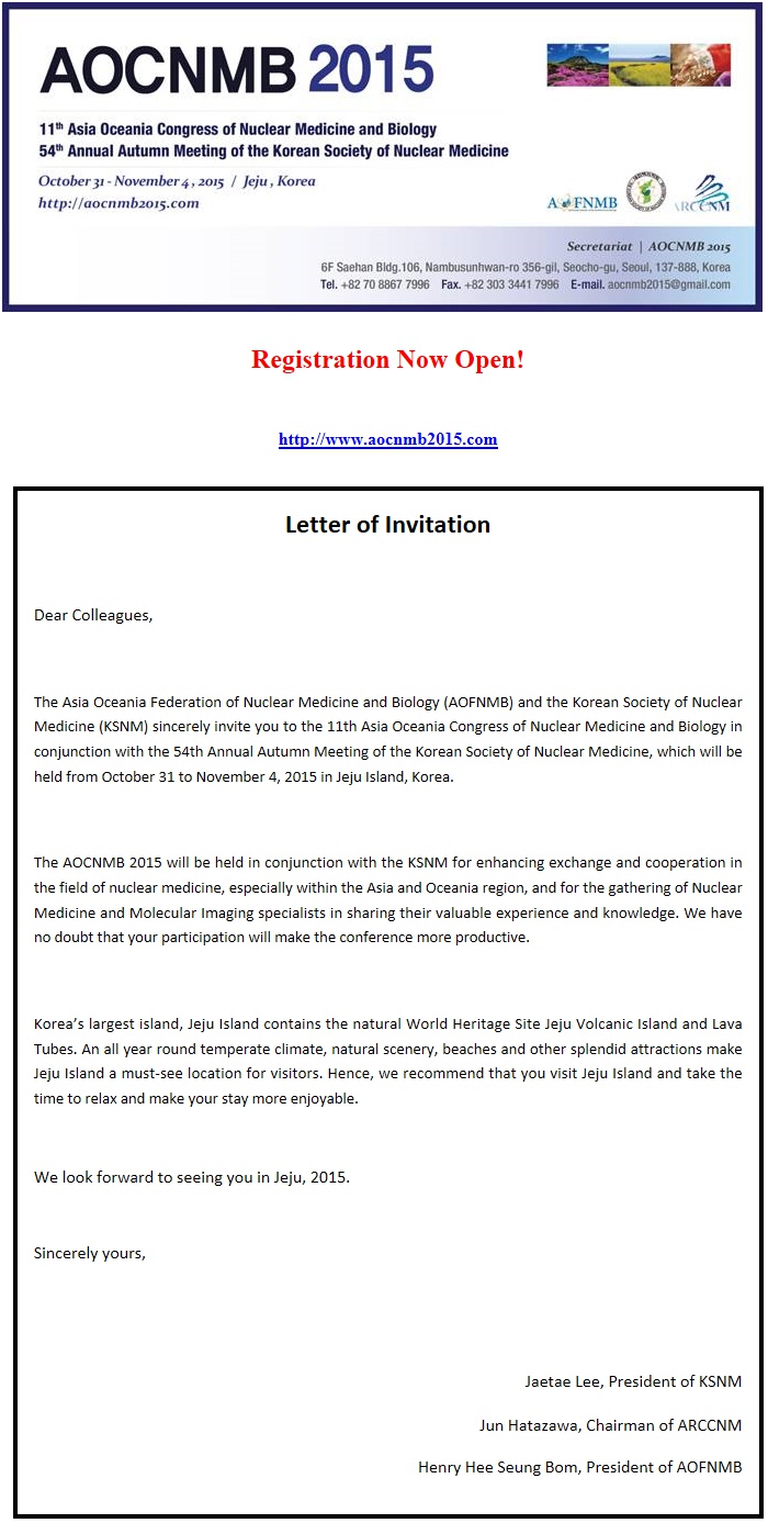 | 제 목 : 2015년 제54차 대한핵의학회 추계학술대회 및 제 11차 아세아-오세아니아 핵의학 및 생물학회(AOCNMB) 안내 | ||||||||