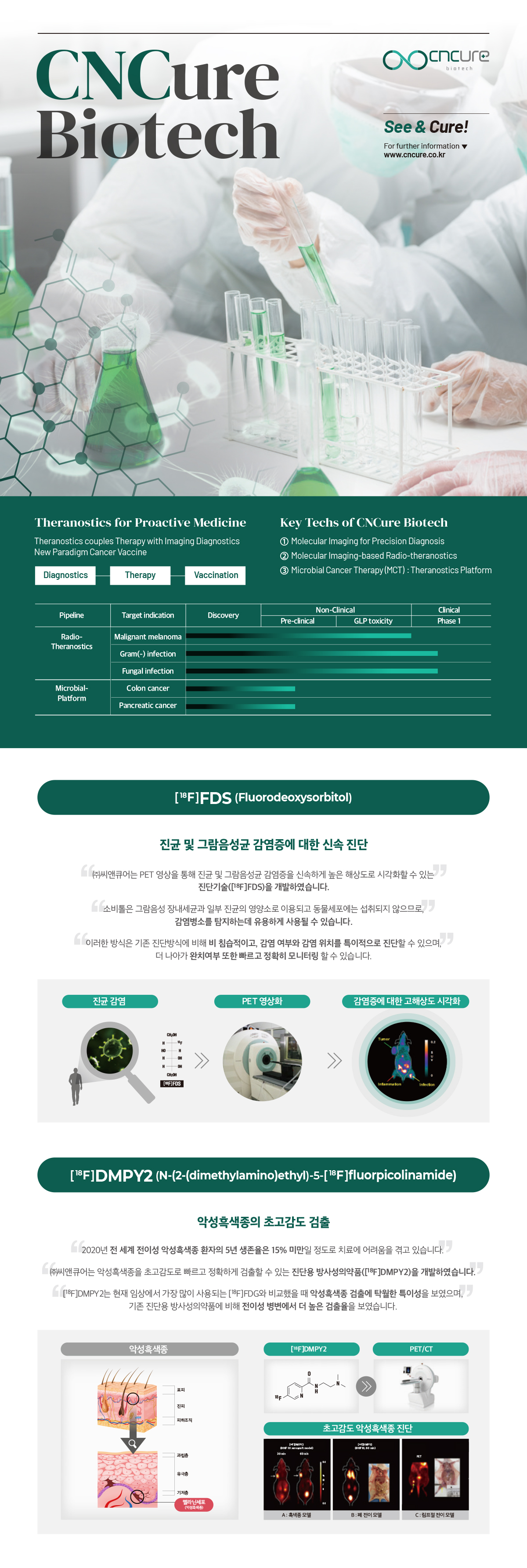 ㈜씨앤큐어는 분자영상/치료용 방사성의약품과 미생물을 기반으로 하는 항암치료제를 개발하는 기업입니다.